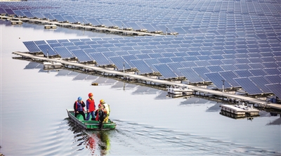 近年来,安徽省淮北市在昔日采煤沉陷区大力发展光伏发电绿色清洁能源,国网淮北公司积极开通新能源项目并网的绿色通道,加快清洁能源消纳,有效助力“碳达峰、碳中和”,带动地方经济、生态双丰收。图为日前国网淮北供电公司员工和电站工作人员一起驾船巡检安徽省淮北市韩村100兆瓦信隋“渔光互补”光伏发电站的设备。■ 据新华网 王文 陈顺/摄