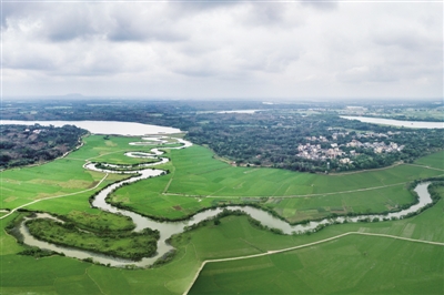 这是2月26日在海口琼山区拍摄的三十六曲溪湿地公园(无人机全景照片)。近日,位于海口琼山区的三十六曲溪湿地公园一片春意盎然。蜿蜒的河道与两岸的早稻田交织成景,处处散发着春天的生机。 ■ 新华社记者 蒲晓旭/摄