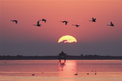 清晨,在山东荣成天鹅湖畔,一群大天鹅映着日出飞翔。日前,随着天气转暖,在山东荣成大天鹅国家级自然保护区,大天鹅们活动频繁,即将开启迁徙之旅。 ■ 新华社发 王福东/摄