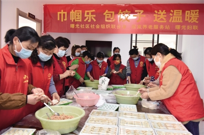 饺子在中国有着财源广进、阖家团圆的美好寓意。3月3日,合肥市包河区曙光社区居家养老服务站联合计生协、妇联、社会组织联合会邀请巾帼志愿者一起开展包饺子比赛,并赠送饺子给社区老人。