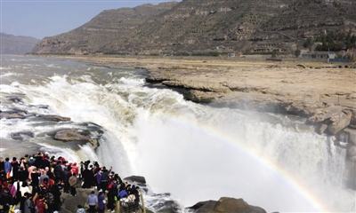 3月8日,游人在陕西壶口瀑布景区游览(无人机照片)。随着气温不断回升,黄河壶口瀑布水流量明显增大,在阳光的照射下,飞瀑与彩虹相映成趣,把一幅动静结合的春天画卷展现在游客眼前。 ■ 新华社记者 陶明/摄