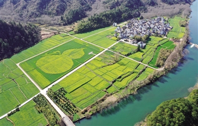 近日,春暖花开,安徽省黄山市休宁县齐云山镇南坑村360多亩油菜花渐次绽放,从空中俯瞰,一个清晰可见的“葫芦” 图案在金黄灿灿的油菜花海中显现,别具创意,在春日暖阳映衬下,蔚为壮观。