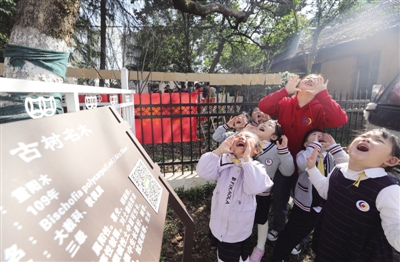 为了让社区的孩子们能够走出校园、亲近大自然,保护身边的古树,在这棵百年古树旁,幼儿园的老师向儿童们讲解了植树节的来历与意义,并引导鼓励孩子们要爱护树木、爱护大自然,养成节约、绿色的生活习惯。孩子们也纷纷表示,要多接触大自然,改善自己的生活方式,爱护我们共同的生活环境。