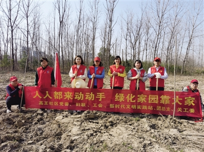星报讯 又到春回大地,芳草吐绿的植树好时节。合肥市骆岗街道高王社区党委联合妇联、工会、新时代文明实践站、团总支、关工委,组织志愿者们在高王辖区开展义务植树活动,以实际行动为骆岗中央公园建设挥锹添绿。