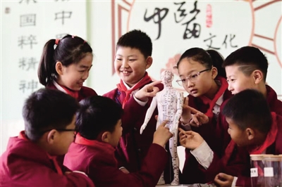 3月15日,合肥市幸福路小学学生在药剂老师的指导下识别中药材,学习人体穴位。当日,学校开展“感受中医魅力·弘扬传统文化”的实践活动,同学们听药剂老师讲解中医药知识,识别中草药、了解人体穴位,感受中医药独特魅力,迎接3月17日中国国医节到来。