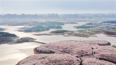 这是3月17日拍摄的贵安新区樱花园(无人机照片)。近日,贵州省贵安新区樱花园内樱花竞相盛开,吸引不少游客前来观赏。贵安新区樱花园占地面积2.4万余亩,园内种植近70万株樱花。 ■ 新华社记者 欧东衢/摄