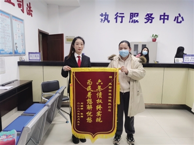 星报讯 近日,申请人刘某将一面印有“六年债权终实现 为民着想解忧愁”的锦旗送到淮南市田家庵区人民法院执行局,对执行干警在案件执行过程中锲而不舍、尽职尽责的态度表示感谢。