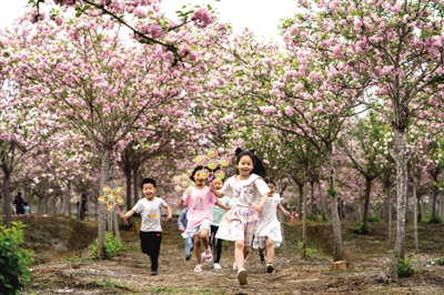 3月19日,在四川省眉山市仁寿县方家镇曲江社区的樱花园里,小朋友们在开心玩耍。春分时节,人们在温暖和煦的春风中踏青、赏花,乐享春日美景。 ■ 新华社发 潘建勇/摄