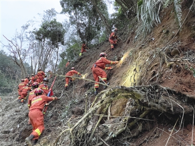 傍晚时分,记者在救援现场看到,大量搜救人员正使用专业工具,牵着多只警犬,进行地毯式排查。只要有一丝生还机会,他们就不会放弃对生命的搜救。 ■ 据新华社