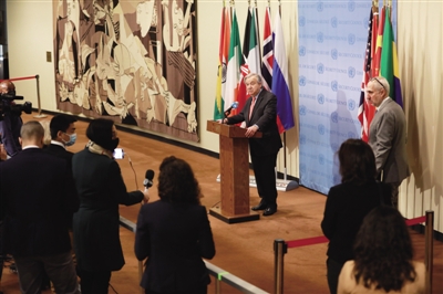 3月22日,在位于纽约的联合国总部,联合国秘书长古特雷斯举行记者会。联合国秘书长古特雷斯22日在纽约联合国总部对媒体表示,必须立即在乌克兰实现停火,有关方面应马上开始认真谈判。 ■ 新华社记者 谢锷/摄