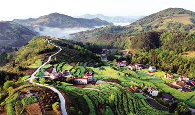 日前拍摄的朝霞下的汉阴县漩涡镇堰坪村古梯田(无人机照片)。近日,秦巴山区的陕西省安康市汉阴县漩涡镇1.2万亩凤堰古梯田在油菜花的映衬下,满目锦绣。有200多年历史的凤堰古梯田,是目前秦巴山区发现面积最大、保存最完整的清代梯田。 ■ 新华社记者 陶明/摄
