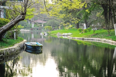 顺着往里走,一片白柳正开着小小的白花,夹着淡淡的绿叶在弯曲的小路边迎着春风自由的摇曳,煞是好看。再往里走,那些原有的楼台亭阁依旧保留着,也许受疫情影响游园的人不多,偶尔亭子里有几位戏剧爱好者在咿咿呀呀地唱戏。儿童乐园要显得嘈杂一些,很多老人带着孩子们在玩耍,孩子们不停奔跑,一会儿滑梯、一会儿秋千、一会儿跷跷板。只可惜滑梯的水泥大象,早已不是我们童年的模样。移步换景来到逍遥津湖,这里建造了一艘木战船,登上战船最高处,俯瞰逍遥津全景,沿岸春风吹绿了杨柳,柳枝轻点水面,新芽发出的嫩绿在水面飘荡,伴随着湖水激起啪啪的拍岸声,仿佛回响出远古时期的战鼓声声,催醒了千年的战魂,惊醒了那场杀声如雷的历史战事……站在战船顶端眺望远处,自问今夕何夕?今日之逍遥湖边,千年的战火熄灭得已无影无踪,连一点点印迹都已寻找不得,有的只是杨柳依依,翠绿如梭般在风中飘扬,绿得养眼、养心。湖中心清波碧水,偶然有几只游船穿桥而过,泛起涟漪,这些游人在平静的水面上沐浴着春天的阳光,让人感受到如此逍遥自在。公园添置了很多休闲坐椅,很多情侣在此相拥,有说不完的情话与缠绵,道不尽人生的况味。
