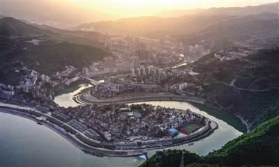 秦巴山深处的陕西省旬阳市城区位于汉江、旬河交汇处。蜿蜒流转的旬河将城区分成“阴阳两鱼岛”,最后流入汉江,造就独具特色的地貌景观。图为旬河与汉江环绕的旬阳城区夕阳景色(无人机照片)。 ■ 新华社记者 陶明/摄
