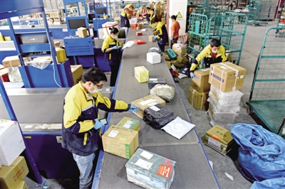 淮南市因疫情全市道路实行临时交通管制后,淮南市邮政部门一手抓疫情防控,一手抓运营保障,加强作业场地精准防控,主动对接政府服务热线,保障防疫生活物资、党报党刊及时送达到用户和群众手中。图为4月12日,淮南市邮件处理中心,邮政工作人员分拣快递件,日均处理快递件9万余件,保障群众防疫、生活物资所需。