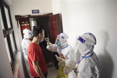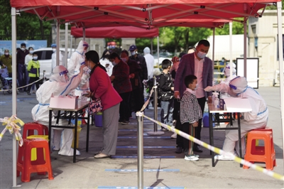 4月20日,在合肥市蜀山区南岗镇和园小区(管控),居民在工作人员的引导下有序进行第二轮核酸检测。据悉,为确保检测现场安全有序,该镇增派工作人员和志愿者、设置一米线,同时在检测现场放置免洗消毒洗手液、口罩等防疫用品,全力提高现场核酸检测的速度。为避免发生封控小区居民下楼集中检测造成交叉感染的风险,蜀山区南岗镇畅园小区(封控)则采取每一栋楼配备三名采样人员实行入户核酸检测。