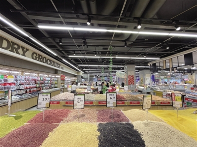 此外,除了老百姓日常所需的“菜篮子”“米袋子”供应,记者在超市内还看到了水果区里满满当当地堆放着苹果、水蜜桃、芒果、香蕉和柑橘等。