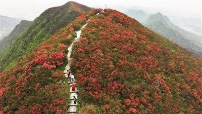 近期,贵州省黔东南苗族侗族自治州丹寨县龙泉山景区的万亩野生杜鹃花竞相绽放,映红山岭,蔚为壮观,引来游人登山赏花,沉醉其中。图为游客在丹寨县龙泉山景区杜鹃花海中游玩。■ 新华社记者 杨楹/摄