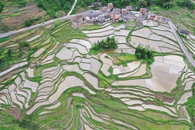 地处武陵山区腹地的重庆市酉阳县花田乡,是远近驰名的万亩梯田贡米之乡。近年来,当地累计实施“旱改水”土地整治7831亩,将原来的撂荒地整治为水田,既提高了耕地质量,又增加了数量。梯田整治后,农户人均分到水田1亩多,亩产稻谷增至800到1000余斤。图为4月25日拍摄的重庆市酉阳县花田乡田园景色。 ■ 新华社记者 唐奕/摄