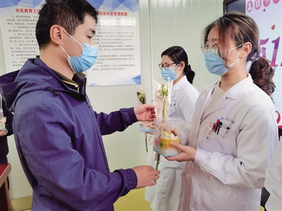 5月10日,合肥市瑶海区铜陵路街道合浦北村社区开展主题党日暨国际护士节活动,社区党员同志向参加活动的结对帮扶单位——同行医院护士献上鲜花、蛋糕和感谢信。