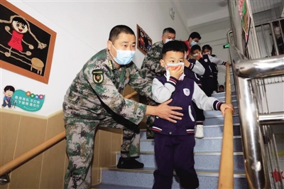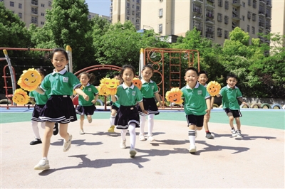 1 5月8日是世界微笑日,在合肥市庐阳区林店街道荣城北苑幼儿园,孩子们手持笑脸图标,开心快乐地奔跑在校园中。■ 赵明 何晶/摄影
