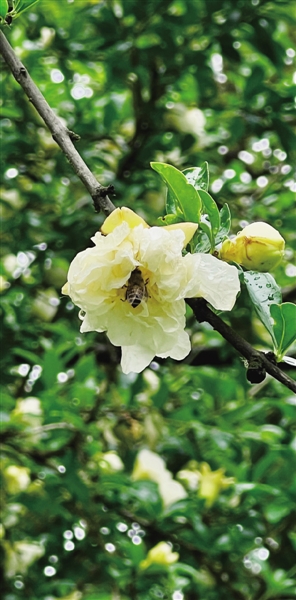 2 5月10日,一场降雨过后,一株石榴树开出了白色的石榴花,在雨后娇艳欲滴。 ■ 祝亮/摄影