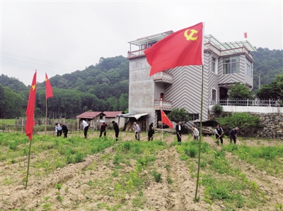 金寨县南溪镇丁埠村在产业一线举办主题党日活动。5月8日,金寨县南溪镇丁埠村组织党员到蚕桑基地锄草,助力产业发展。
