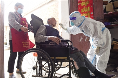 5月12日,寿县堰口镇中心卫生院护士洪蕴在八沟村为村民进行核酸采样。
