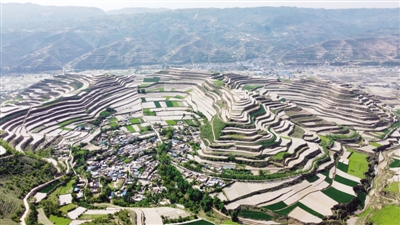 日前,海拔2100米的甘肃省天水市武山县马力镇万亩玉米种植基地青苗吐绿。 近年来,武山县加大撂荒地整治力度,建成高标准农田9.89万亩,鼓励农民专业合作社等新型经营主体积极参与,持续推广全膜双垄沟播玉米、脱毒马铃薯、优质小麦种植,使撂荒地变成了“保粮田”,切实提高了粮食综合生产能力。■ 新华社记者 郎兵兵/摄