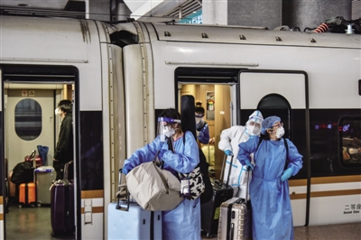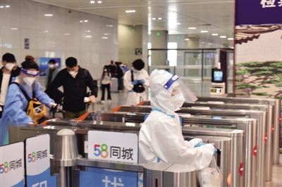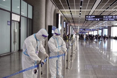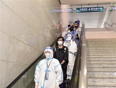 记者了解到,根据工作人员引导,这些乘客从站台乘坐电动扶梯到达出站口,然后走专用通道到达等候区。他们中有的需要中转换乘高铁,有的需要去机场换乘飞机,有的则需要乘坐大巴到隔离酒店,集中进行健康观察。