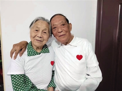 结婚70年来,唯一让张爷爷觉得有点小遗憾的是,这么多年没送给老伴一份像样的礼物,但是社区为张爷爷弥补了这个小遗憾,为他们老两口准备了有爱的情侣装,老两口穿上情侣装一个劲地笑。