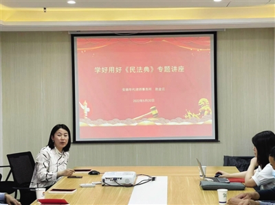 今年5月是我国第二个“民法典宣传月”,合肥市大杨镇水库村积极创新普法形式,村党总支联合村妇联、工会、司法、信访、老龄委开展以“美好生活 民法典相伴”为主题的普法活动,线上通过在小区党员群和业主群转发民法典普法文章、小视频、知识竞赛答题等内容进行广泛宣传,引导小区群众在线学习《民法典》,线下由党员组成的普法工作小组在小区宣传栏张贴普法宣传海报,悬挂《民法典》宣传横幅,分发《民法典知识宣传册》,组建《民法典》党员宣讲队,并邀请村法律顾问在家门口进行普法讲座,为辖区的职工群众宣传民法典相关知识。