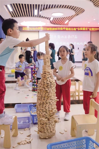 不一会儿,他们搭建的“塔”都已经初见雏形。在造型上,孩子们尽情发挥着自己的想象,创意无限,有六片一层、七片一层、八片一层,按序叠放的“稳妥型”;有下面立放、上面叠放的“别致型”;也有按照古罗马建筑风格摆放的“镂空型”。最终,合肥市森林海幼儿园、蜀麓幼儿园、西园新村幼儿园分获此次比赛一、二、三名。