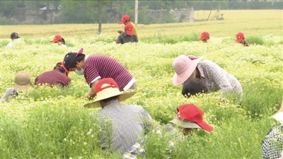 白色花瓣、嫩黄花蕊、翠绿花茎,五月初夏,一朵朵洋甘菊竞相开放,形成一片花海,扮靓了乡村。近日,在宿州市埇桥区符离镇丁集村,洋甘菊种植基地负责人杨大庆表示:洋甘菊浑身是宝,一亩地收入一万元左右。据了解,在杨大庆的洋甘菊种植基地里,固定务工群众有40多人,采花高峰期,一天需要二三百人,带动了更多村民实现家门口就业增收致富。