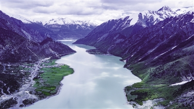 位于西藏昌都市八宿县境内的然乌湖是由山体滑坡或泥石流堵塞河道而形成的堰塞湖,面积22平方千米,是西藏东部最大的湖泊。图为5月30日拍摄的然乌湖风光(无人机照片)。 ■ 新华社记者 周荻潇/摄