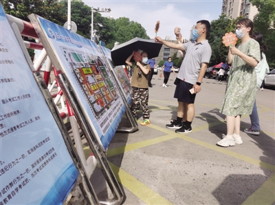 家长和学生在校门外看指示牌。 ■ 记者 周诚/图