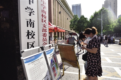 合肥五十中天鹅湖校区家长帮孩子看考场。 ■ 记者 沈娟娟/图