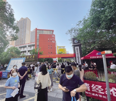 合肥五十中蜀外校区门口聚焦了许多看考场的人。 ■ 记者 张贤良/图