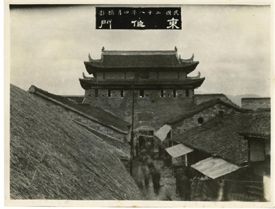 这张桐城城门照片上方笺注有文字“民国二十八年四月摄影”,拍摄于1939年,也就是抗日战争时期。从老照片中可以看出,这座城门的台基皆由城砖砌筑而成,上部设有瞭望口和射击口。台基之上建有城楼,城楼均系砖木构建。