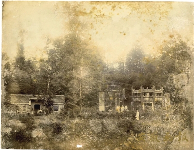 张英墓位于桐城县城西北的龙眠山,现墓前石雕等皆已损毁。这张照片拍摄于清末,从照片中可清楚地看到在墓道的最前方,树立着一座四柱三间的石牌坊,牌坊正中的匾额上镌有“恩荣”二字。在牌坊的两侧立着三块高大的石碑,有雕刻精美的碑头和“赑屃”碑座,从画面中人物的比例看,石碑通高在四米左右。牌坊后为墓道,墓道两侧有石狮、石羊、石马和石人等,再往上为数级高台,三层高台上有石质的香炉等五供,再上三级高台即为墓冢,墓冢一周有低垣环绕,墓碑立于墓冢后方。整个墓地依山而建,墓地周围垒石环护,四周树林茂密,最左侧则是享堂,供亲属及后代祭祀先人。