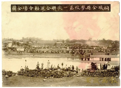 照片上方写有“桐城全县学校第一次联合运动会场全图”,画面中可以看到在河边(据考为城东的龙眠河)的一片空地上围满了观众,场地内柱子间拉着的横线上挂了不少彩旗。场地一侧用木头、松枝搭建了一个花门,门头写着“运动会”三个字,门两侧又分别写有“合群”“尚武”字样。
