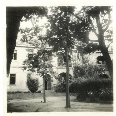 浮山中学位于浮山南麓,为乡贤房秩伍先生于民国十三年(1924年)创办。该校内有一座二层西洋式教学楼,名为“中大楼”,建造于1926年,建筑面积850余平方米,砖木结构,每层七开间,用作教室、图书馆和教务处。这张照片拍摄了教学楼和院落一角,楼前有树木与花坛,环境清幽。