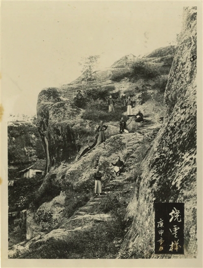 浮山,又名浮渡山,《桐城县志》载:“浮山,离城八十里。”今属枞阳县。浮山自然风光秀丽,有“三十六岩”“七十二洞”,会胜岩是浮山中部胜景,在云霄峰下,北宋时远禄和尚会欧阳修诸圣贤于此,故名“会圣岩”,岩高5米,岩后有台,上供佛像,香火旺盛。会胜岩的这张照片右下角注有“会胜岩全景,庚申重阳”,可知拍摄于1920年重阳节。另一张照片为浮山绕云梯,位于梯云峰下,本为天然石磴,又经人工加凿,共有108级,经五折而上,石级宽仅容一人,峰不峻而险。照片右下角注有“绕云梯,庚申重九”,也是1920年重阳节这天拍摄。 ■ 据《安徽画报》