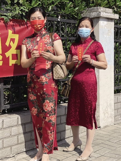 在合肥市第四十八中学望湖校区,望湖社区为考生家长发放“金榜题名”“旗开得胜”的书签。