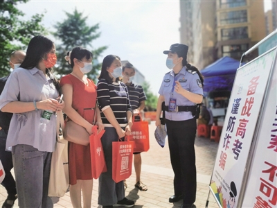 昨日,合肥市荷叶地街道在50中天鹅湖教育集团蜀外校区考点开展“高考专项反诈”宣传活动,民警以案说法,向家长宣传反诈知识。