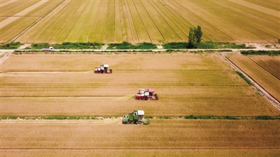 眼下正是冬小麦收获的季节,“滨北粮仓”山东省惠民县抢抓有利天气,积极开展“三夏”生产作业,颗粒归仓。 图为6月7日,在山东省惠民县桑落墅镇,农民驾驶农机收获小麦(无人机照片)。