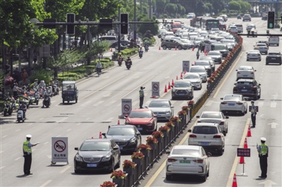 合肥第九中学,高考英语听力时段,庐阳交警引导车辆有序通过考场周边路段。