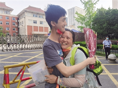 1 合肥九中考点,妈妈给孩子送上鲜花祝福,孩子拥抱妈妈。 ■ 祁琳