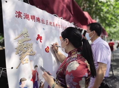 3 在合肥一中和四十六中考点,包河区烟墩街道滨湖明珠社区设置高考祝福留言板,大家齐为高考考生加油鼓劲。 ■ 胡蕾 沈娟娟
