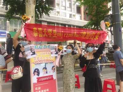 4 合肥庐阳中学考点,“亲友团”拉起了庆祝横幅。 ■ 王珊珊