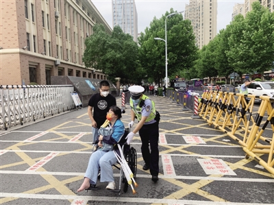 6月14日中考首日,在合肥46中南校区考点,一名受伤女学生坐着轮椅前来参考,在考点执勤的合肥市公安局交警支队滨湖大队民警护送考生进入考场。 ■ 尤磊 记者 唐朝